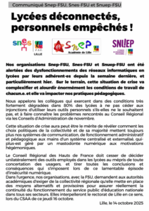Nos organisations Snep-FSU, Snes-FSU et Snuep-FSU ont été alertées des dysfonctionnements des réseaux informatiques en lycées par leurs adhérent-es depuis la semaine dernière, et particulièrement hier. Sur le terrain, cette situation de crise va complexifier et alourdir énormément les conditions de travail de chacun.e. et elle va impacter nos pratiques pédagogiques.